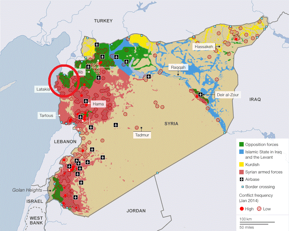 Map of the areas of control by various armed actors on the ground inside Syria. Circled zone the area of insurgent-held territory in Latakia.