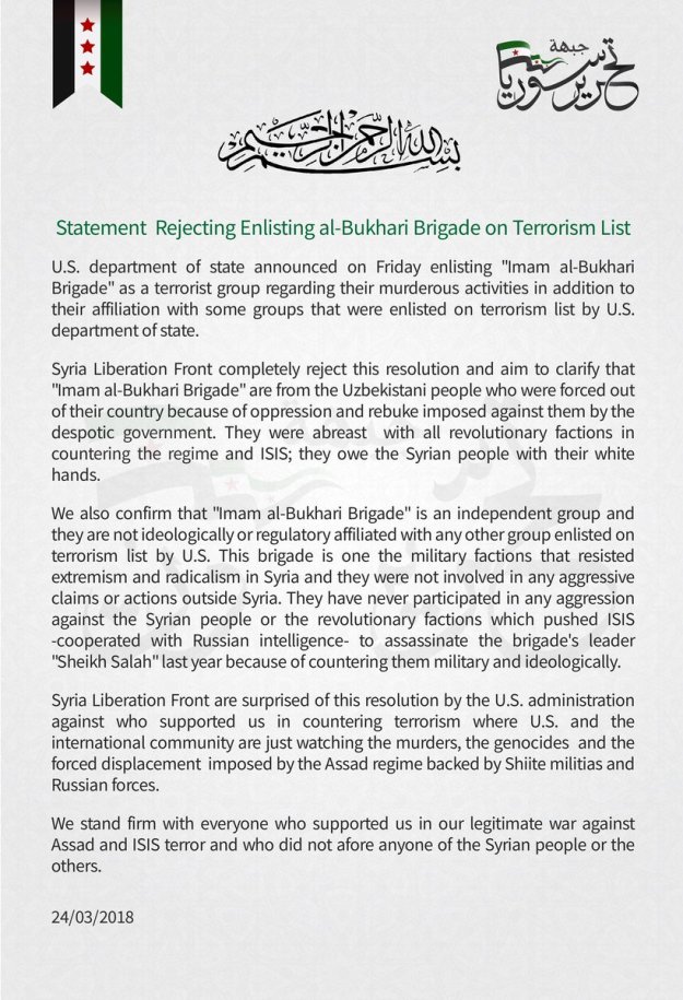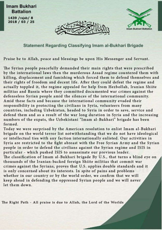 The United States Department of State designated Katibat al-Imam al-Bukhari (KIB), the Taliban-loyal insurgent unit in Syria, as a Specially Designated Global Terrorist (SDGT) on 22 March. Over the last few days, KIB and other insurgent groups have issued statements in response.