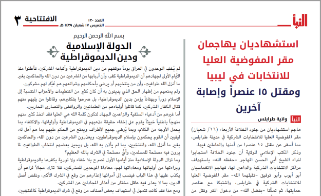 The 130th edition of Al-Naba, the Islamic State’s (IS) newsletter, was published on 4 May 2018. On page 3, there was an article about IS’s position on democracy, which is reproduced below. Continue reading