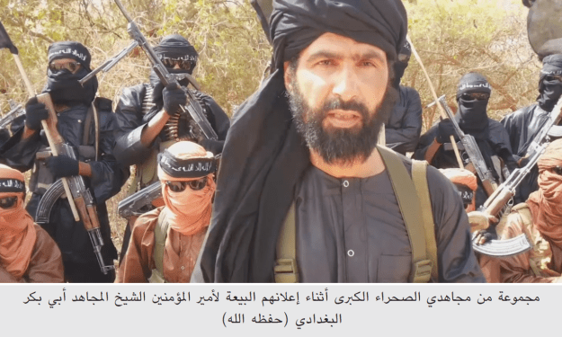 There was also, unusually, a picture [below] on page eleven, captioned, “A Group of Mujahideen of the Greater Sahara (Al-Sahra al-Kubra) during their Declaration of Allegiance to the Commander of the Faithful, the Mujahid-Shaykh Abu Bakr al-Baghdadi”. In the picture is the Lehbib Yumani (Abu Walid al-Sahrawi), whose group, Al-Murabitun, joined IS in May 2015.