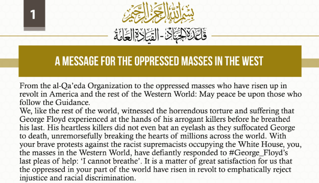 Al-Qaeda’s General Command released a statement on 29 June 2020 through its As-Sahab Media, entitled, “A Message For The Oppressed Masses In The West”, which seeks to capitalise on the recent unrest in the United States by offering Islam as the solution to racial divisions. Al-Qaeda, of course, diagnoses the root cause of America’s problems in its greed “Jewish overlords”, an antisemitic conspiracy theory that is common to most jihadists. The text of this message is reproduced below. Continue reading