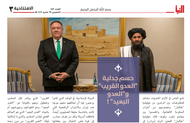The two most notable aspects of Al-Naba 252—expanded on below—were the devotion of the main editorial on page three to an attack on the Taliban for the deal they have made with the Americans over Afghanistan, and IS finally claiming responsibility for the murder of the French aid workers in Niger on 9 August, while continuing its ideological war with Al-Qaeda in Africa. Continue reading