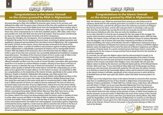 Al-Qaeda’s General Command released a statement earlier today through As-Sahab Media congratulating the Taliban on its victory in Afghanistan. This is the first statement from Al-Qaeda Central since the cataclysmic events in Afghanistan over the past few weeks. The official silence of the organisation heretofore—even as its operatives worked in lock-step with the rest of the coalition of jihadists run by Pakistan’s Inter-Services Intelligence (ISI) to conquer the country—is almost certainly deliberate, to allow the Taliban and the United States political cover to ensure the American departure while avoiding the ramifications of Al-Qaeda controlling the Afghan state, the very thing the mission in Afghanistan was intended to (and had succeeded in, so long as it was sustained) undoing. The statement itself is exactly what one would expect: gloating about the West’s defeat and the damage to American hegemony, saying this proves that jihad is the only way, and that the Taliban’s “Islamic Emirate” is merely the first step in a global campaign to bring the world under the rule of the shari’a. The text of the English-language statement is posted below, with some minor editions for transliteration and translation. Continue reading