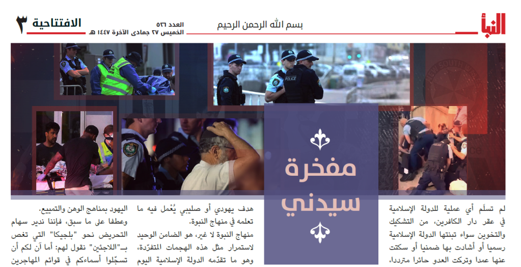 The Islamic State’s Al-Naba Editorial on the Bondi Hanukkah Massacre Leave a reply By Kyle Orton (@KyleWOrton) on 28 December 2025 Read the article over at Substack. Share this: Click to share on X (Opens in new window) X Click to share on Facebook (Opens in new window) Facebook Click to share on Reddit (Opens in new window) Reddit Like Loading...