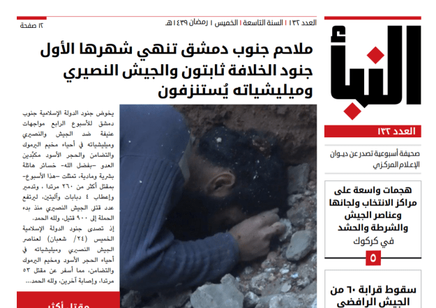 The 130th edition of Al-Naba, the Islamic State’s (IS) newsletter, was published on 4 May 2018. The main story on the first page was, “For the Second Week, Soldiers of the Caliphate in Southern Damascus Inflict Heavy Losses on the Nusayri Army”, and this continued on page 4.