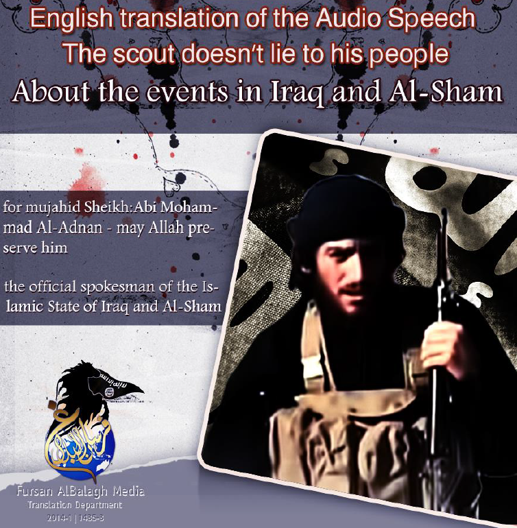 Taha Falaha (Abu Muhammad al-Adnani) is probably most famous for the September 2014 speech he made as the official spokesman for the Islamic State (IS) calling for international terrorist attacks, which initiated a wave of atrocities in Europe and beyond lasting about three years. But Falaha had been in office by that time, formally, since the summer of 2011, and in total he would make two-dozen speeches before he was killed at the end of August 2016. The twelfth speech, entitled, “The Scout Doesn’t Lie to His People”, and reproduced below,[1] was made on 7 January 2014, four days after the onset of a massive assault on IS by the Syrian rebellion that inter alia killed senior jihadist commanders like Samir al-Khlifawi (Haji Bakr or Abu Bakr al-Iraqi). What is interesting about this speech, as revealed in the recent Al-Naba profile of Falaha’s great friend and collaborator, the media emir Wael al-Ta’i (Abu Muhammad al-Furqan), is that Falaha composed this speech while he was besieged by the rebels in Aleppo. Al-Ta’i had evacuated the IS media department and their families, then slipped back into the area surrounded by the rebels to help Falaha compose IS’s first political counter-measure to this unexpected development in Syria, which was followed nearly a fortnight afterwards by a speech from the caliph himself, Ibrahim al-Badri (Abu Bakr al-Baghdadi). Continue reading