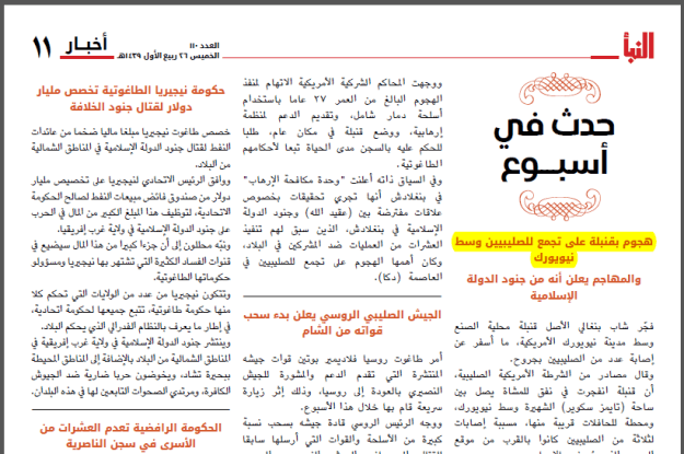 In the 110th issue of the Islamic State’s newsletter, Al-Naba, released on 15 December 2017, the jihadists claimed responsibility for the attempted pipe bomb attack at the Port Authority bus terminal in Manhattan, New York City, on 11 December 2017. The claim appeared on page 11 of 12 in a section entitled, “Events of the Week”. The text of the claim is reproduced below. Continue reading
