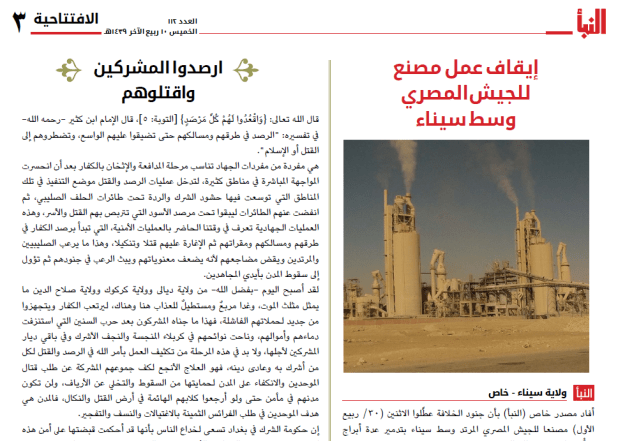 The 112th edition of the Islamic State’s newsletter, Al-Naba, released on 29 December 2017 contained an article on page 3, which reported that the reversion from statehood to insurgency was yielding results, particularly in the Diyala, Kirkuk, and Saladin provinces of Iraq. The article is reproduced below. Continue reading