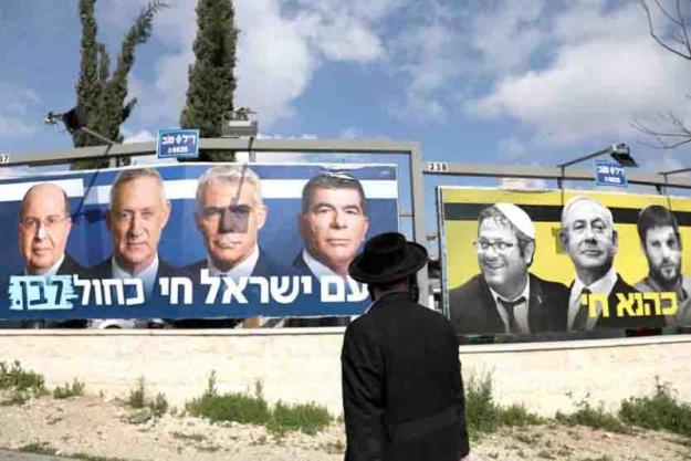 An Orthodox Jewish man looking at Israeli election campaign posters in Jerusalem, 27 March 2019 // Reuters