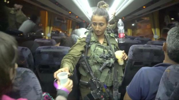 An Israeli solider hands out water on a bus, during the Syria Civil Defence extraction from the Golan Heights // 22 July 2018, provided by Israeli Army to Reuters