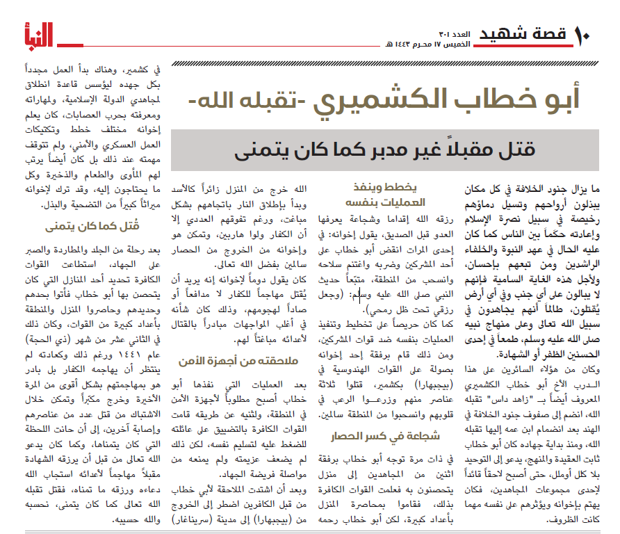 Al-Naba 301, page ten, headline reads: “Abu Khattab al-Kashmiri — May God Accept Him”