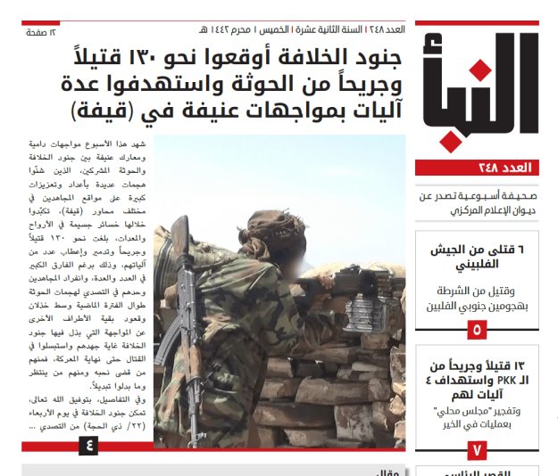 The Islamic State (IS) produced the 248th edition of Al-Naba, its newsletter, on 20 August. The front page was devoted to recent events in Yemen, which had not gone well for IS—although one could easily miss that fact when reading a story that a focuses almost entirely on enemy casualties and the failures of others. IS is, of course, not pleased about the Israeli normalisation of relations with the United Arab Emirates, but Al-Naba makes clear that it is more perturbed that Muslims should believe Turkey or Qatar are any better than the U.A.E., despite their different approach to Islamists. Al-Naba 248 documents IS’s continuing advances in Afghanistan—and, indeed, Iraq, Syria, Africa (the Sahel), and Egypt. There is also a report of insurgent activity in the Philippines. Continue reading