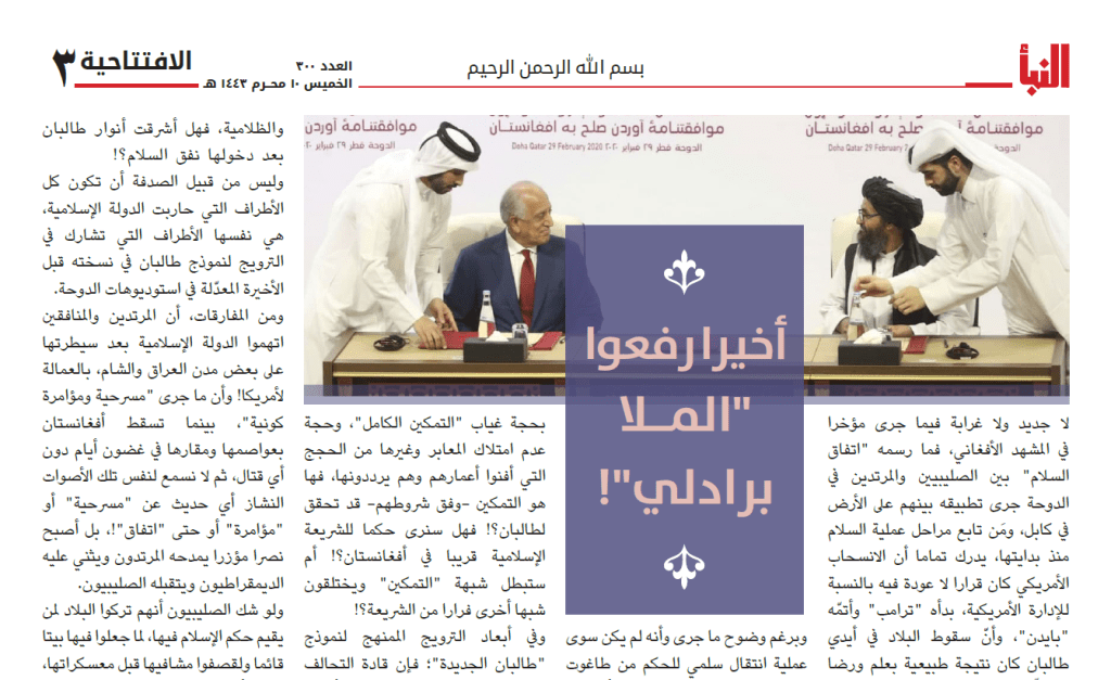 The Islamic State (IS) released the 300th edition of its weekly newsletter, Al-Naba, on 19 August, wherein the main editorial on page three dealt with the fall of Afghanistan to the Taliban on 15 August. The editorial was entitled, “Finally, They Elevated Mullah Bradley”. IS has used the term “Mullah Bradley” or “Mullah Bradley project” to refer to the Taliban, the accusation basically being that the Taliban are American agents. (The Taliban obviously are agents of a foreign power, but not the Americans.) The rest of the editorial fleshes out this idea that the U.S. and the Taliban have conspired in the Talibanization of Afghanistan, and the fact that all other Islamists support this—the Sururis, Muslim Brotherhood, etc.—only shows that IS is the sole standard bearer of Islam. Continue reading