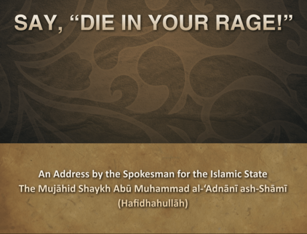 The spokesman of the Islamic State (ISIS), Abu Muhammad al-Adnani, gave a speech today entitled, “Say, ‘Die in Your Rage’,” which is drawn from a Surah of the Qur’an [3:119]. The main announcement from Adnani is the acceptance of another wilayat (province), i.e. foreign branch of IS, this time in Afghanistan, led by Hafiz Saeed Khan, a former Tehrik-i-Taliban Pakistan (TTP) or “Pakistani Taliban” commander who broke away and formed a pro-ISIS faction in October. This follows the first declaration on this matter a month ago by IS’s caliph, Abu Bakr al-Baghdadi, which accepted “provinces” from Saudi Arabia, Yemen, Egypt, Libya, and Algeria. Adnani went on to make the foredoomed request that the Afghan jihadists “abandon disunity and factionalism” in order to join ISIS. Continue reading