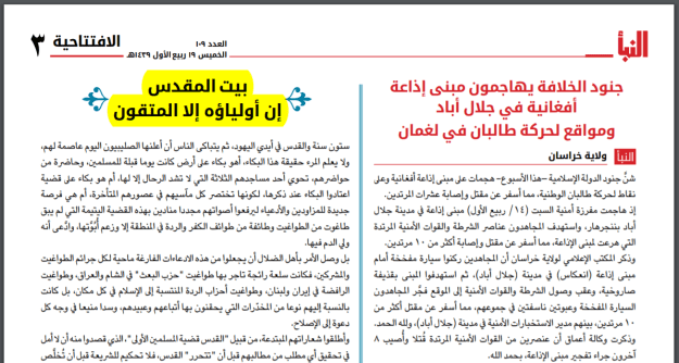 The Islamic State responded to President Donald Trump’s announcement, on 6 December 2017, that the United States would move its Embassy in Israel from Tel Aviv and Jerusalem, with an editorial on page 3 of the 109th edition of Al-Naba on 8 December 2017. Below is a very rough translation. Continue reading