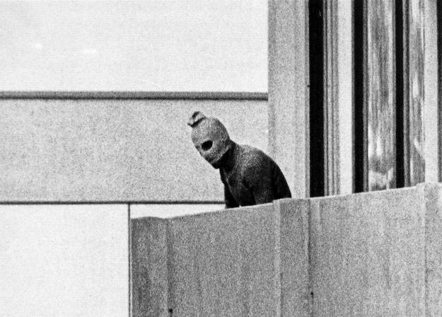 A Black September terrorist appears on the balcony in the Olympic Village in Munich, September 1972 (photo via AP)