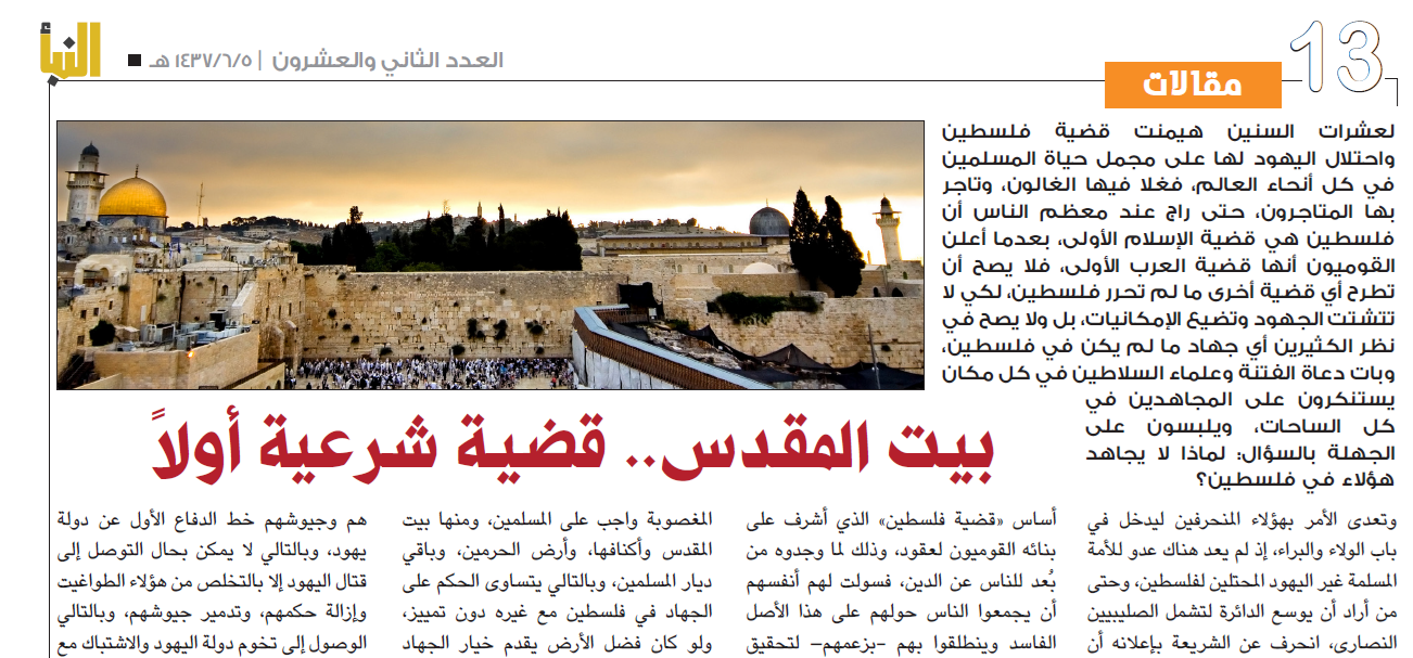 An article in the twenty-second edition of al-Naba, the Islamic State’s (IS) newsletter, released on 15 March 2016, explained why the group has not made fighting Israel a priority.