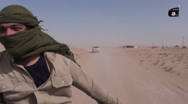 Taha Falaha (Abu Muhammad al-Adnani) [right] appearing in an Islamic State video alongside Tarkhan Batirashvili (Abu Umar al-Shishani, 3 June 2017, displaying a scene from 2014 when IS demolished the borders between Iraq and Syria. Falaha was killed in August 2016. It is common for IS to hold back pictures and footage of its leaders for time-spans that can reach over a decade.
