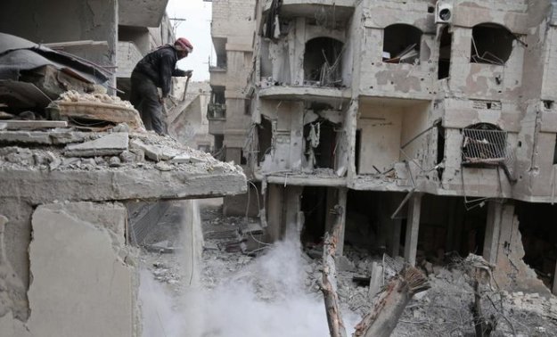 Aftermath of a pro-Asad coalition bombing in Hamouria, in besieged Eastern Ghuta, near Damascus, 22 February 2018. (AFP)