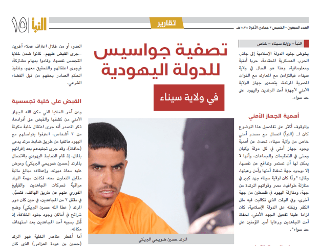 In the 70th edition of Al-Naba, the weekly newsletter of the Islamic State (IS), entitled, “The Liquidation of Spies for the Jewish State” (tasfiya juwasees lil-dawla al-yahudiya), which did include a description of IS’s Wilayat Sinai having eliminated an Israeli spy network, but also included more general information about the IS security structure in Egypt. Continue reading
